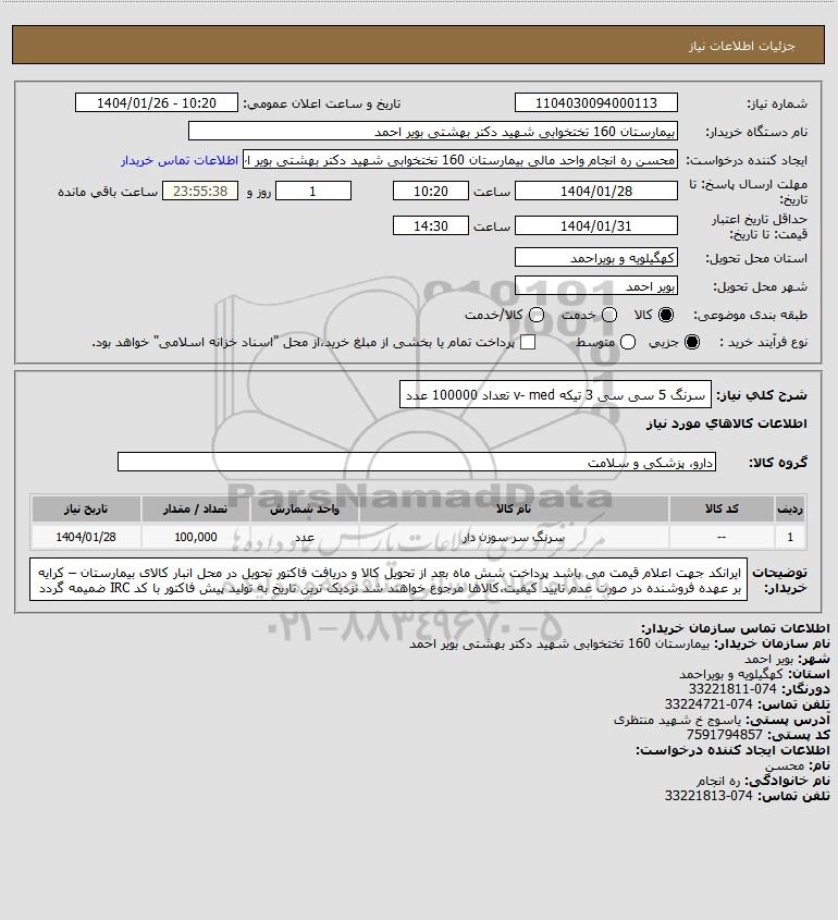 استعلام سرنگ 5 سی سی 3 تیکه v- med تعداد 100000 عدد, استعلام سرنگ 5 سی سی 3 تیکه v- med تعداد 100000 عدد