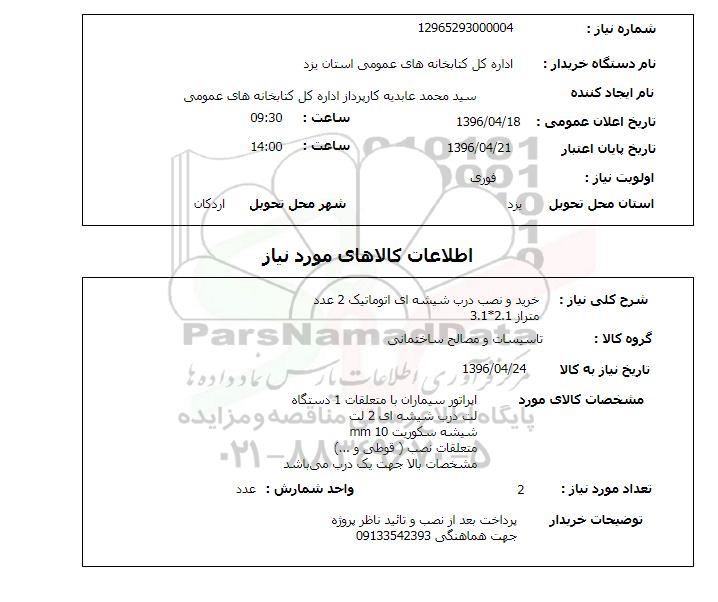 شرح کلی نیاز: خرید و نصب درب شیشه ای اتومایتک 2 عدد متراژ 2.1*3.1