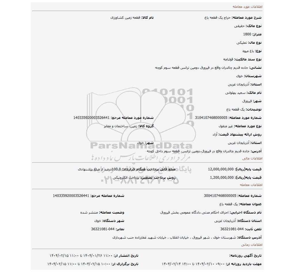 | شرح مورد معامله: حراج یک قطعه باغ | نام کالا: قطعه زمین کشاورزی | |