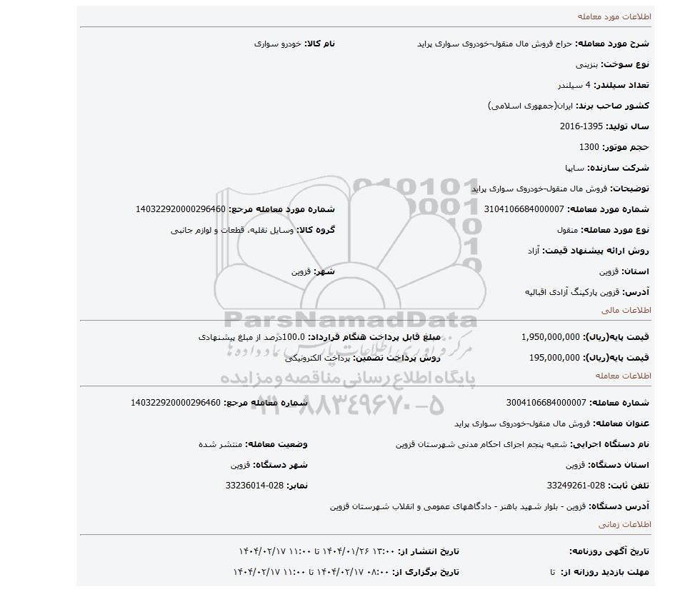 | عنوان معامله: فروش مال منقول-خودروی سواری پراید | ||