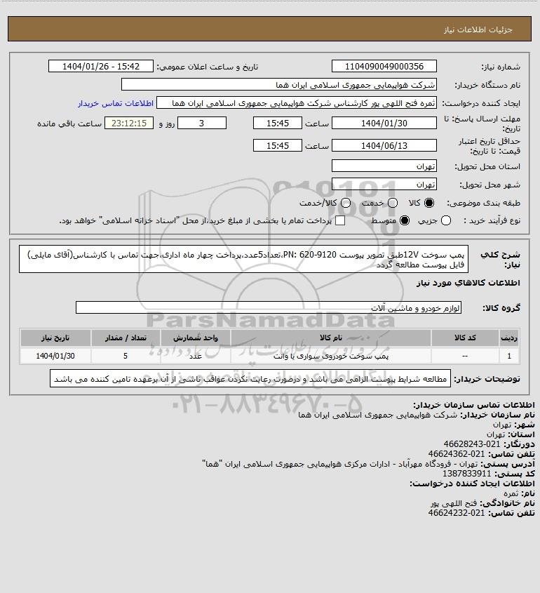 شرح کلی نیاز: پمپ سوخت 12Vطبق تصویر پیوست PN: 620-9120،تعداد5عدد،پرداخت چهار ماه اداری،جهت تماس با کارشناس(آقای مایلی) فایل پیوست مطالعه گردد
