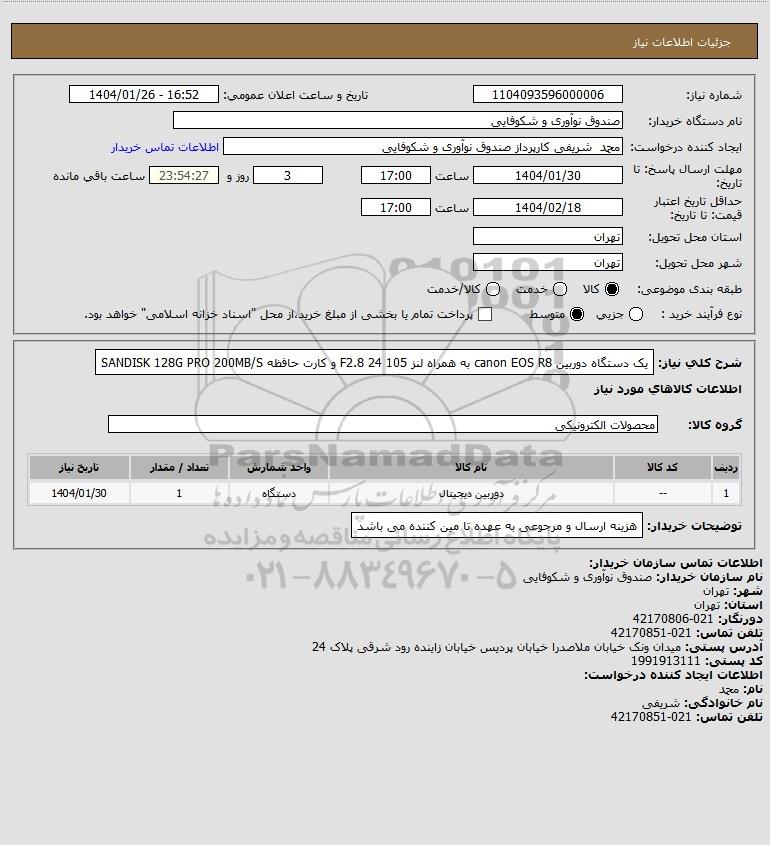 شرح کلی نیاز: یک دستگاه دوربین canon EOS R8 به همراه لنز F2.8 24 105 و کارت حافظه SANDISK 128G PRO 200MB/S