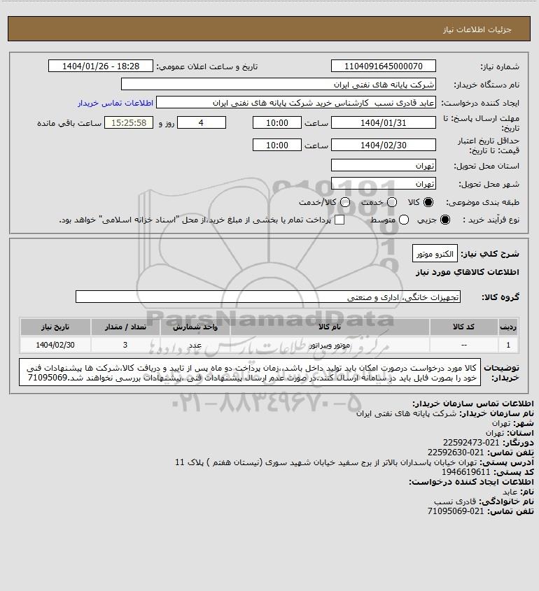 استعلام بها و موضوع استعلام استعلام الکترو موتور به اطلاع کلیه شرکتها و افراد متخصص واجد شرایط میرساند، آگهی گذار در نظر دارد از طریق استعلام بها، نسبت به انتخاب و دریافت پیشنهادات اقدام نماید. این استعلام با کد آگهی ثبت شده در سامانه خبرگزاری پارس نماد : 8879099 منتشر شده است. مشخصات استعلام : تاریخ شروع استعلام: 1404/01/26 آخرین مهلت ارسال پیشنهاد قیمت : 1404/01/31 و محل اجرای پروژه : استان تهران میباشد. استعلام قیمت مورد درخواست : استعلام الکترو موتور با دستهبندیهای تخصصی و گروه های مرتبط : الکتروموتور و پمپ های شناور, تجهیزات نفت و گاز, استعلام اطلاع رسانی میگردد.