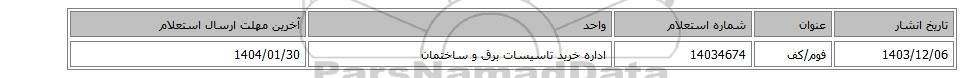 | 1403/12/06 | فوم/کف | 14034674 | اداره خرید تاسیسات برق و ساختمان | 1404/01/30 |