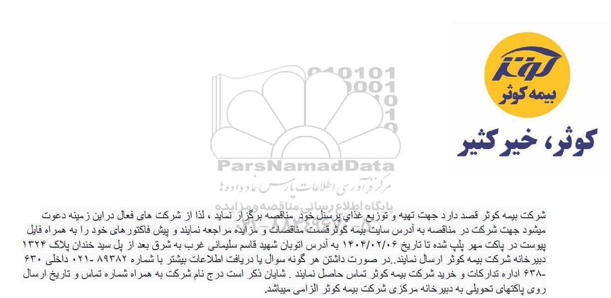 شرکت بیمه کوثر قصد دارد جهت تهیه و توزیع غذای پرسنل خود مناقصه برگزار نماید ، لذا از شرکت های فعال در این زمینه دعوت می شود جهت شرکت در مناقصه به آدرس سایت بیمه کوثر قسمت مناقصات و مزایده مراجعه نمایند و پیش فاکتورهای خود را به همراه فایل پیوست در پاکت مهر پلمپ شده تا تاریخ 1404.02.06 به آدرس اتوبان شهید قاسم سلیمانی غرب به شرق بعد از پل سید خندان پلاک 1324 دبیرخانه شرکت بیمه کوثر ارسال نمایند. در صورت داشتن هر گونه سوال یا دریافت اطلاعات بیشتر با شماره 89382 - 021 داخلی 630 - 638 اداره تدارکات و خرید شرکت بیمه کوثر تماس حاصل نمایند. شایان ذکر است درج نام شرکت به همراه شماره تماس و تاریخ ارسال روی پاکت های تحویلی به دبیرخانه مرکزی شرکت بیمه کوثر الزامی می باشد.
