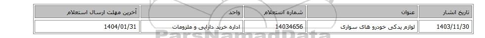 1403/11/30لوازم یدکی خودرو های سواری14034656اداره خرید دارایی و ملزومات1404/01/31