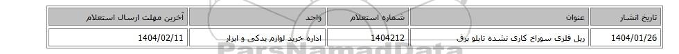 | 1404/01/26 | ریل فلزی سوراخ کاری نشده تابلو برق | 1404212 | اداره خرید لوازم یدکی و ابزار | 1404/02/11 |