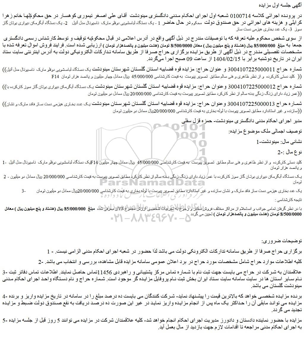 در پرونده اجرائی کلاسه 0100714 شعبه اول اجرای احکام مدنی دادگستری مینودشت  آقای علی اصغر تیموری کوهسار در حق محکومٌ لها خانم زهرا کرایلی و هزینه های اجرائی در حق صندوق دولت  محکوم در حال حاضر 1 - یک دستگاه لباسشویی دوقلو مارک  ناسیونال مدل آنیل    2- یک دستگاه آبگرمکن دیواری بوتان گاز سوز  3- یک عدد بخاری هیزمی دست ساز