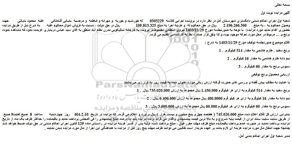 شعبه اول اجرای احکام مدنی دادگستری شهرستان آمل در نظر دارد در پرونده اجرایی کلاسه 0303229 له خورشید و حوریه و مهرانه و فاطمه و مرضیه بابائی آقاملکی علیه محمود بابائی جهت وصول محکوم به ، به مبلغ 2.196.266.500 ریال در حق محکوم له و هزینه اجرا به مبلغ 109.813.325 ریال در حق دولت ، نسبت به فروش اموال محکوم علیه به شرح ذیل از طریق مزایده حضوری اقدام نماید مورد مزایده: با توجه به صورتجلسه مورخ 1403/11/29 نیروی انتظامی مضبوط در پرونده به کارخانه شالیکوبی مدرن نظام آباد متعلق به آقای سید عباس دریاباری عزیمت نموه که مشاهده نموده برنج و ... مربوط در محل مورد تعرفه موجود بوده و لذا وفق قرار صادره نظریه کارشناسی تقدیم می گردد.