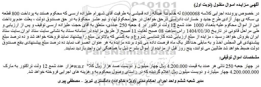 در خصوص پرونده اجرایی کلاسه 0300068 له خانم ندا عبداله زاده قمیشی به طرفیت آقای شهرام علیزاده ارسی که محکوم هستند به پرداخت 800 قطعه ی سکه ی بهار آزادی طرح جدید و خسارات دادرسی درحق خواهان در حق محکومٌ لها، و نیم عشر محکومٌ به در حق صندوق دولت ، بعلت عدم پرداخت دین از اموال محکوم علیه بتعداد 1000 عدد شمع 12 ولت تراکتور در 4 جعبه 250 عددی، متعلق به آقای حجت علیزاده ارسی توقیف و پس از ارزیابی و طی مراحل قانونی در تاریخ 1404/01/30 راس ساعت 08 صبح لغایت 11 صبح از طریق مزایده در سامانه ستاد به نشانی سایت ستاد ایران.سایت ستاد ایران بفروش خواهد رسید ، مزایده از مبلغ ارزیابی شده کارشناسی شروع و به کسی که بالاترین مبلغ را پیشنهاد نماید فروخته خواهد شد و ده درصد مبلغ پیشنهادی فی المجلس اخذ و به مابقی حداکثر یک ماه فرصت داده می شود برنده مزایده به هر عنوان انصراف نماید ده درصد مبلغ پیشنهادی بنفع صندوق دولت ضبط خواهد شد طالبین می توانند، پنج روز قبل از مزایده از اموال بشرح ذیل با هماهنگی این واحد بازدید نمایند.