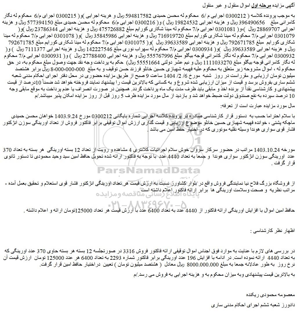به موجب پرونده کلاسه ( 0300212 اجرایی م /6  محکوم له محسن حمیدی 594817582 ریال و هرینه اجرایی )و( 0300215 اجرای م/6  محکوم له نگار کامرانی مبلغ    396490656 ریال و هزینه اجرایی 19824532 ریال ) و( 0300216 اجرایی م/6  محکوم له محسن حمیدی مبلغ 577394150 ریال و هزینه اجرایی 28869707 ریال  )،و( 0301081 اجرایی م/7 محکوم له مینا شکاری کورایم مبلغ 475726882 ریال و هزینه اجرایی 23786344 ریال )و( 0301079 اجرایی م/7 محکوم له مینا شکاری کورایم مبلغ 716919720 ریال و هزینه اجرایی 35845986 ریال  )و( 0301078 اجرایی م/7 محکوم له مینا شکاری کورایم  مبلغ 792671785 ریال و هزینه اجرایی 39633589 ریال  )و( 0301075 اجرایی م/7 محکوم له مینا شکاری کورایم مبلغ 792671785 ریال و هزینه اجرایی 39633589 ریال  )و( 0300934 اجرایی م/7 محکوم له سهراب نوری مبلغ 142227546 ریال و هزینه اجرایی 7111377 ریال  ) و( 0300932 اجرایی م/7 محکوم له نگار کامرانی قوجه بیگلو مبلغ 555767996 ریال و هزینه اجرایی 27788400 ریال  ) و( 0300931 اجرایی م/7 محکوم له نگار کامرانی قوجه بیگلو مبلغ 1111033270 ریال و نیم عشر دولتی 55551664 ریال)  حکم به پرداخت وجه نقد جهت وصول مبلغ محکوم به، در حق محکوم له ، اموال مشروحه زیر متعلق به محکوم علیه فهیمه شهبازی حسین خانلو فرزند حسن توقیف و به مبلغ  8،000،000،000 ریال برابر هشتصد میلیون تومان ارزیابی و مقرراست در روز  شنبه  مورخ 6/ 2/ 1404 ساعت 9 صبح از طریق مزایده حضوری در محل دفتر اجرای احکام مدنی شعبه ششم ساری بفروش برسد و قیمت از میزان ارزیابی شده شروع و به کسانی که بالاترین قیمت را پیشنهاد نمایند فروخته خواهد شد ضمناً 10درصد از قیمت پیشنهادی و کارشناسی نقداً از برنده اخذ و مابقی باید ظرف مدت یک ماه پرداخت گردد. همچنین در صورت انصراف یا عدم پرداخت به موقع مابقی وجه 10 درصد سپرده به نفع صندوق دولت ضبط خواهد شد و بازدید از مال مورد مزایده ظرف 5 روز قبل از روز مزایده امکان پذیر میباشد./م