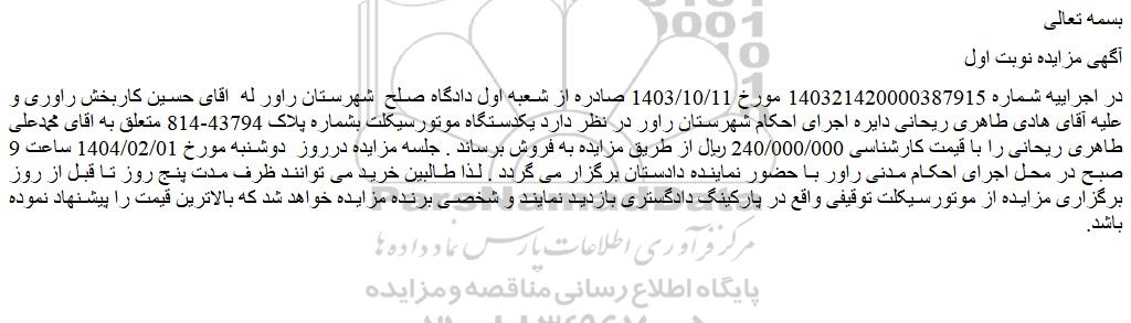 در اجراییه شماره 140321420000387915 مورخ 1403/10/11 صادره از شعبه اول دادگاه صلح شهرستان راور له اقای حسین کاربخش راوری و علیه آقای هادی طاهری ریحانی دایره اجرای احکام شهرستان راور در نظر دارد یکدستگاه موتورسیکلت بشماره پلاک 43794-814 متعلق به اقای محمدعلی طاهری ریحانی را با قیمت کارشناسی 240/000/000 ریال از طریق مزایده به فروش برساند . جلسه مزایده درروز دوشنبه مورخ 1404/02/01 ساعت 9 صبح در محل اجرای احکام مدنی راور با حضور نماینده دادستان برگزار می گردد . لذا طالبین خرید می توانند ظرف مدت پنج روز تا قبل از روز برگزاری مزایده از موتورسیکلت توقیفی واقع در پارکینگ دادگستری بازدید نمایند و شخصی برنده مزایده خواهد شد که بالاترین قیمت را پیشنهاد نموده باشد.