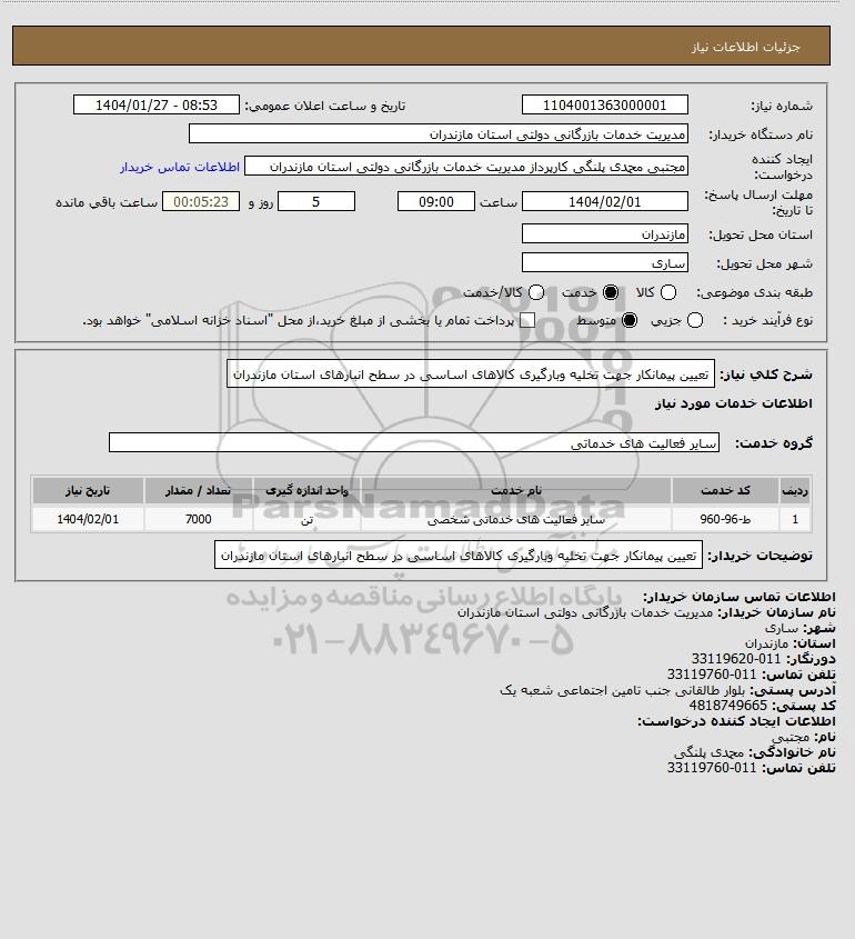 شرح کلی نیاز: تعیین پیمانکار جهت تخلیه وبارگیری کالاهای اساسی در سطح انبارهای استان مازندران