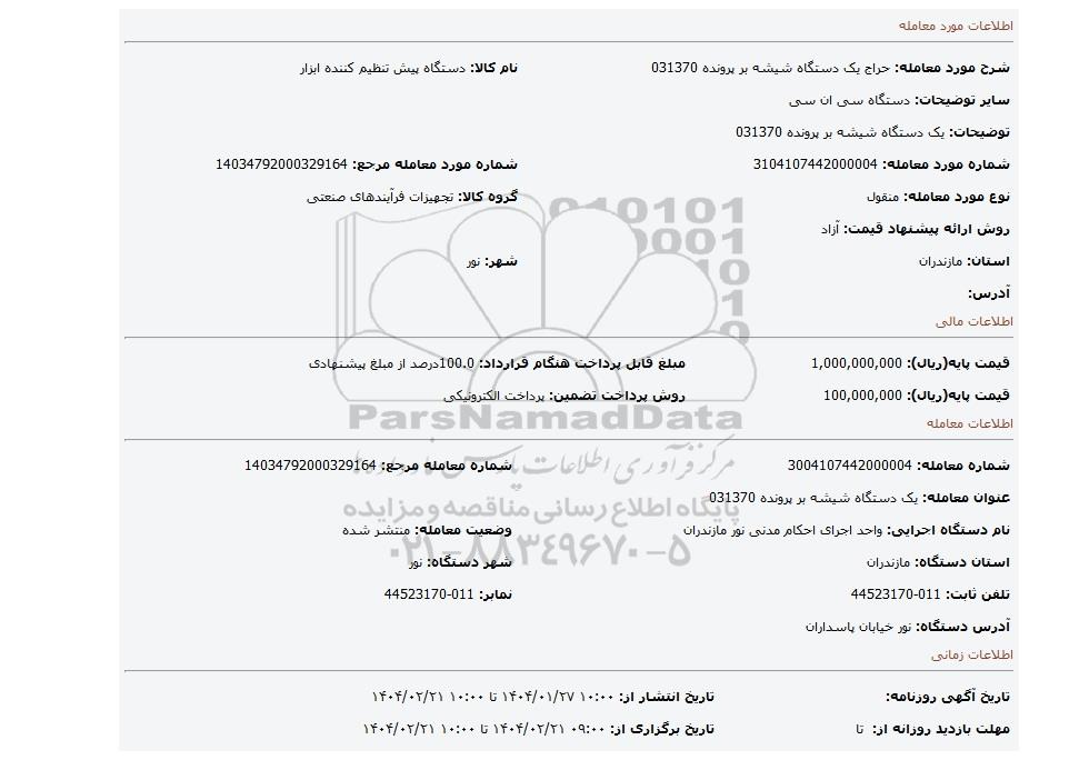 | عنوان معامله: یک دستگاه شیشه بر پرونده 031370 | ||
