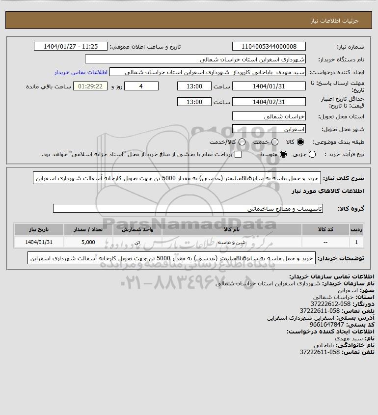 توضیحات خریدار:خرید و حمل ماسه به سایز6تا8میلیمتر (عدسی) به مقدار 5000 تن جهت تحویل کارخانه آسفالت شهرداری اسفراین