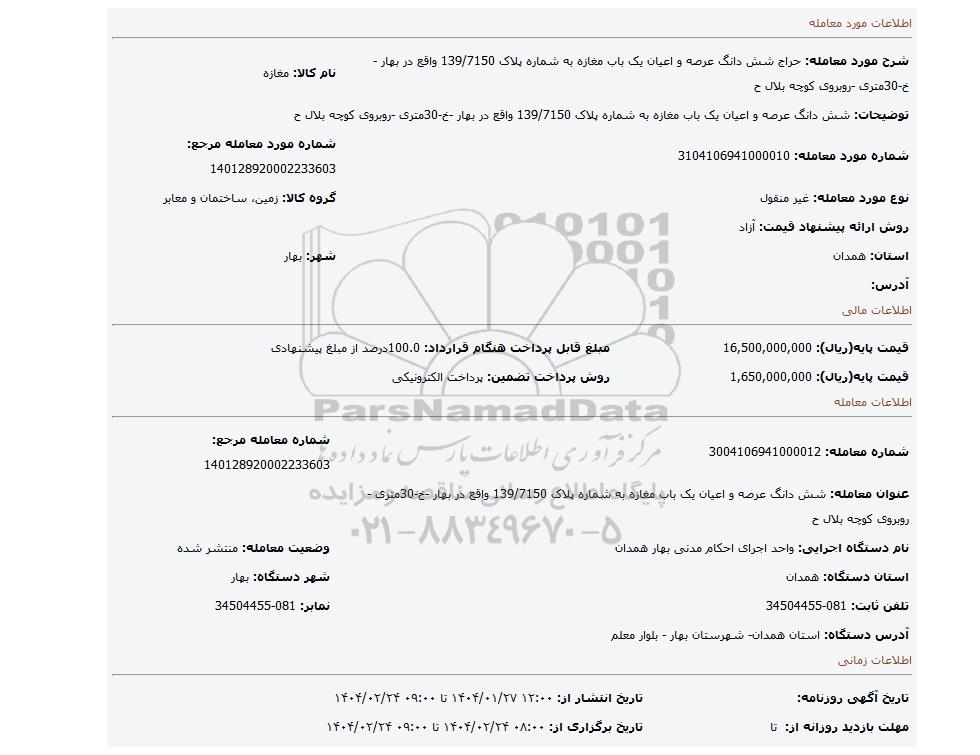| عنوان معامله: شش دانگ عرصه و اعیان یک باب مغازه به شماره پلاک 139/7150 واقع در بهار -خ-30متری -روبروی کوچه بلال ح | ||