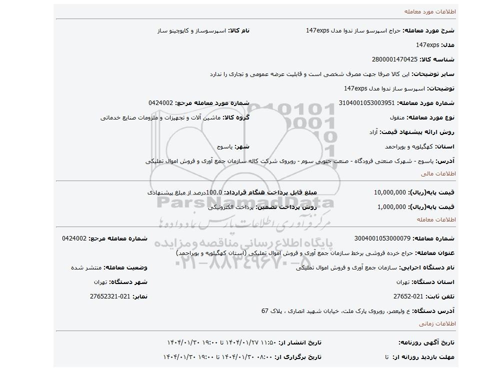 مزایده عمومی مزایده اسپرسو ساز ندوا مدل 147exps برگزار میگردد. از کلیه افراد متخصص و شرکتهای واجد شرایط دعوت به عمل میآید تا در این مزایده با کد خبرگزاری پارس نماد : 8883400 شرکت نمایند تاریخ شروع مزایده : 1404/01/27 مهلت شرکت در مزایده: تا پایان روز 1404/01/30 مکان برگزاری اموال واگذاری استانهای کهگیلویه و بویراحمد و دستهبندیهای مربوط به این حراجی متفرقه میباشد.