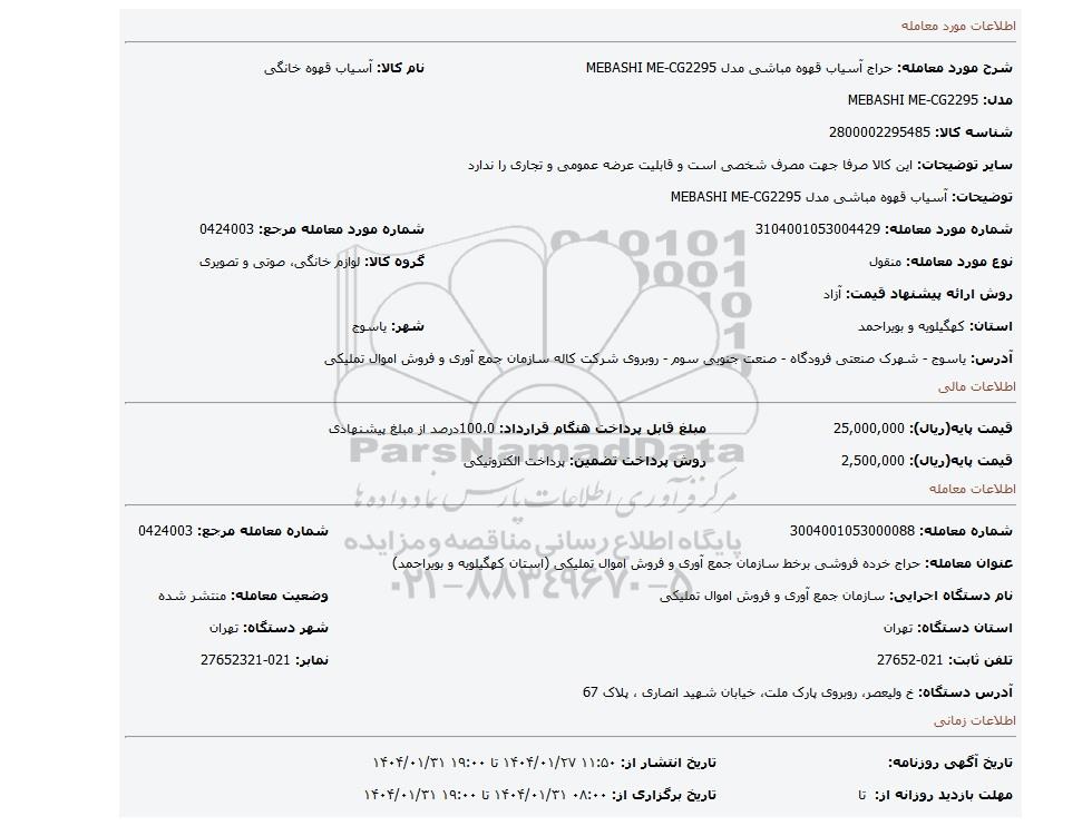 مزایده عمومی مزایده آسیاب قهوه مباشی مدل MEBASHI ME-CG2295 برگزار میگردد. از کلیه افراد متخصص و شرکتهای واجد شرایط دعوت به عمل میآید تا در این مزایده با کد خبرگزاری پارس نماد : 8883441 شرکت نمایند تاریخ شروع مزایده : 1404/01/27 مهلت شرکت در مزایده: تا پایان روز 1404/01/31 مکان برگزاری اموال واگذاری استانهای کهگیلویه و بویراحمد و دستهبندیهای مربوط به این حراجی متفرقه میباشد.
