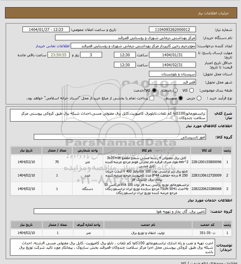 شرح کلی نیاز: ترانسفورماتور100کاوا کم تلفات،تابلوبرق کامپوزیت،کابل برق مفتولی مسی،احداث شبکه برق طبق کروکی پیوستی مرکز سلامت چندوکان