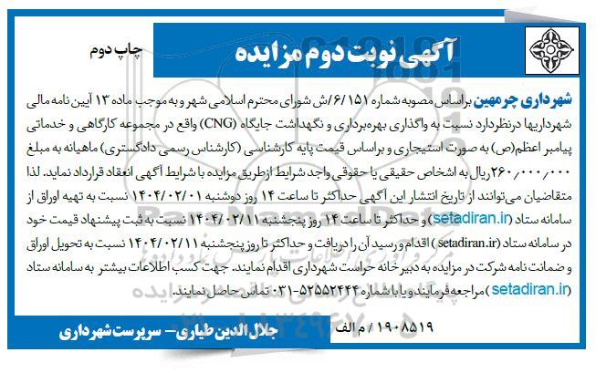 شهرداری چرمهین بر اساس مصوبه شماره 6/151/ش شورای محترم اسلامی شهر و به موجب ماده 13 آیین نامه مالی شهرداری ها در نظر دارد نسبت به واگذاری بهره برداری و نگهداشت جایگاه CNG واقع در مجموعه کارگاهی خدماتی پیامبر اعظم به صورت استیجاری و بر اساس قیمت پایه کارشناسی (کارشناس رسمی دادگستری) ماهیانه به مبلغ 260.000.000 ریال به اشخاص حقیقی یا حقوقی واجد شرایط از طریق مزایده با شرایط آگهی انعقاد قرارداد نماید. لذا متقاضیان می توانند از تاریخ انتشار این آگهی حداکثر تا ساعت 14 روز دوشنبه مورخ 1404.2.1 نسبت به تهیه اوراق از سامانه ستاد و حداکثر تا ساعت 14 روز پنجشنبه مورخ 1404.2.11 نسبت به ثبت پیشنهاد قیمت خود در سامانه ستاد ایران اقدام و رسید آن را دریافت و حداکثر تا روز پنجشنبه 1404.2.11 نسبت به تحویل اوراق و ضمانت نامه شرکت در مزایده به دبیرخانه حراست شهرداری اقدام نمایند.