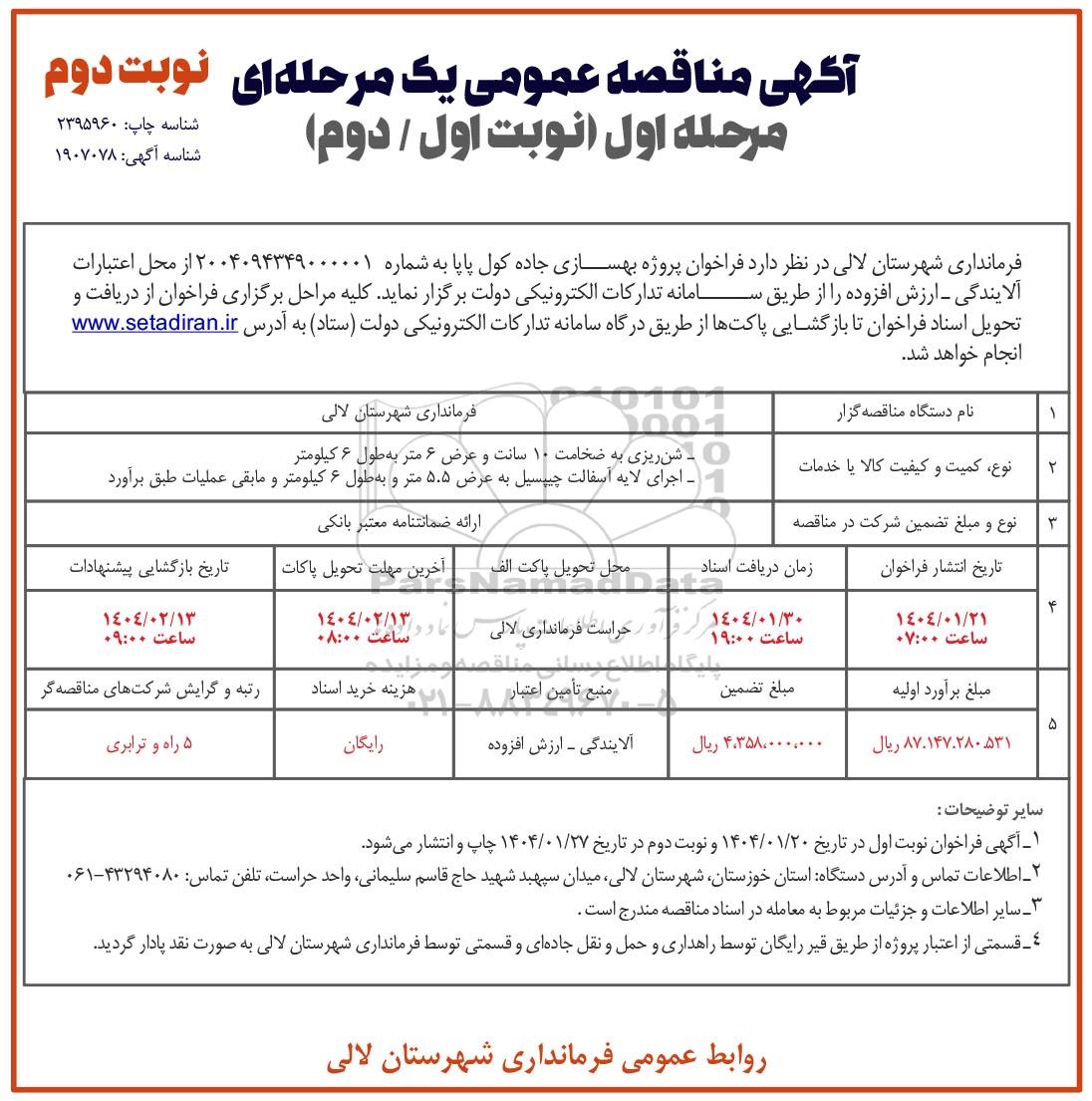 فرمانداری شهرستان لالی در نظر دارد فراخوان پروژه بهسازی جاده کول پاپا به شماره 2004094349000001 از محل اعتبارات آلایندگی - ارزش افزوده را از طریق سامانه تدارکات الکترونیکی دولت برگزار نماید کلیه مراحل برگزاری فراخوان از دریافت و تحویل اسناد فراخوان تا بازگشایی پاکتها از طریق درگاه سامانه تدارکات الکترونیکی دولت (ستاد) به آدرس انجام خواهد شد.