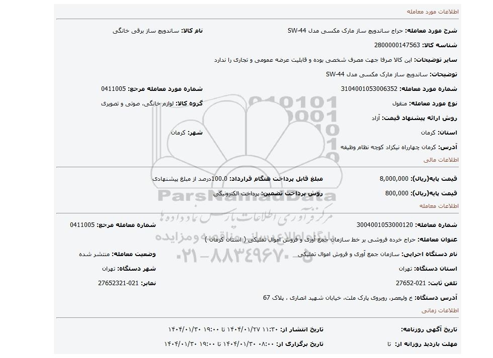 | شرح مورد معامله: حراج ساندویچ ساز مارک مکسی مدل SW-44 | نام کالا: ساندویچ ساز برقی خانگی | |