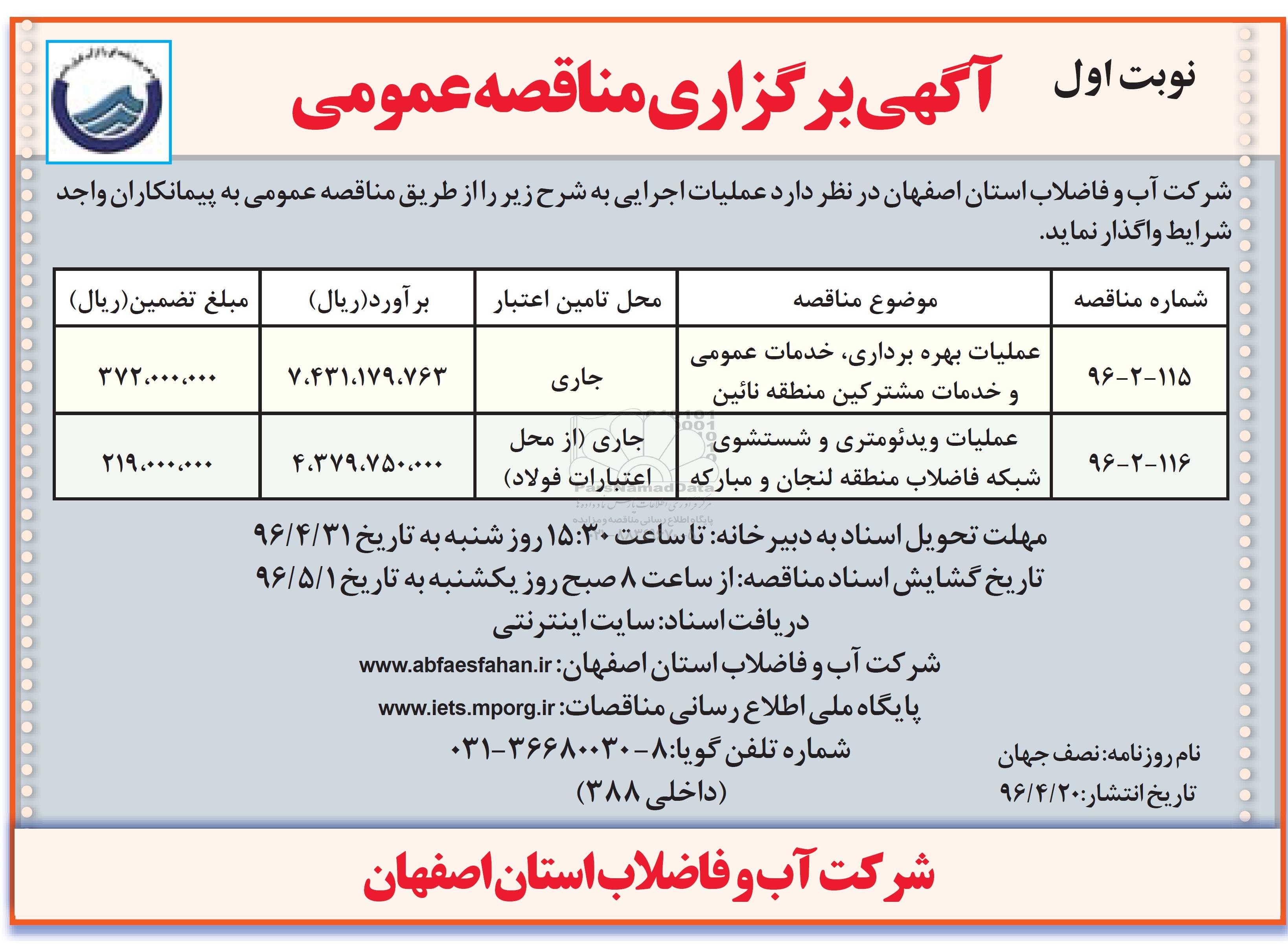 شرکت آب و فاضلاب استان اصفهان در نظر دارد عملیات اجرایی به شرح زیر را از طریق مناقصه عمومی به پیمانکاران واجد شرایط واگذار نماید.