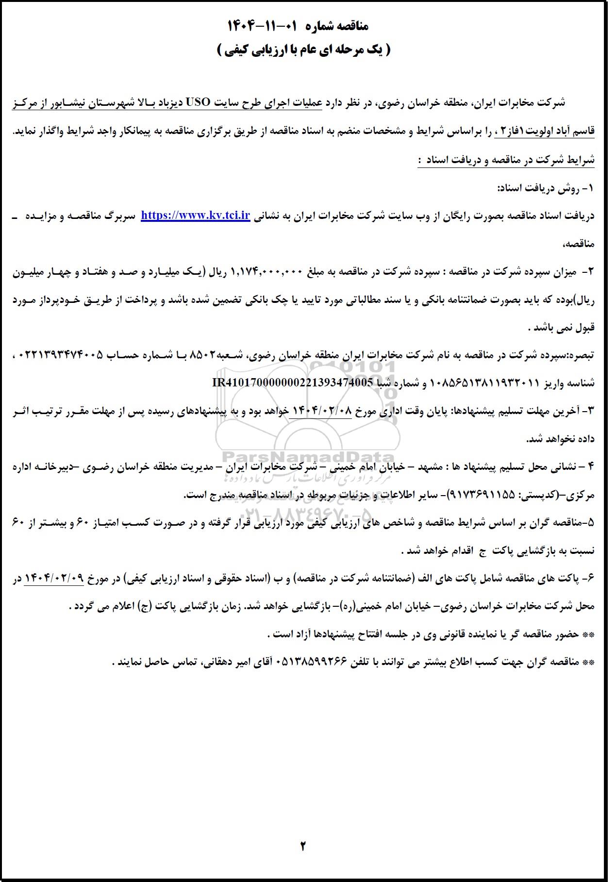 شرکت مخابرات ایران منطقه خراسان رضوی در نظر دارد عملیات اجرای طرح سایت USO دیزباد بالا شهرستان نیشابور از مرکز قاسم آباد اولویت 1 فاز 2 را بر اساس شرایط و مشخصات منضم به اسناد مناقصه از طریق برگزاری مناقصه به پیمانکار واجد شرایط واگذار نماید.
