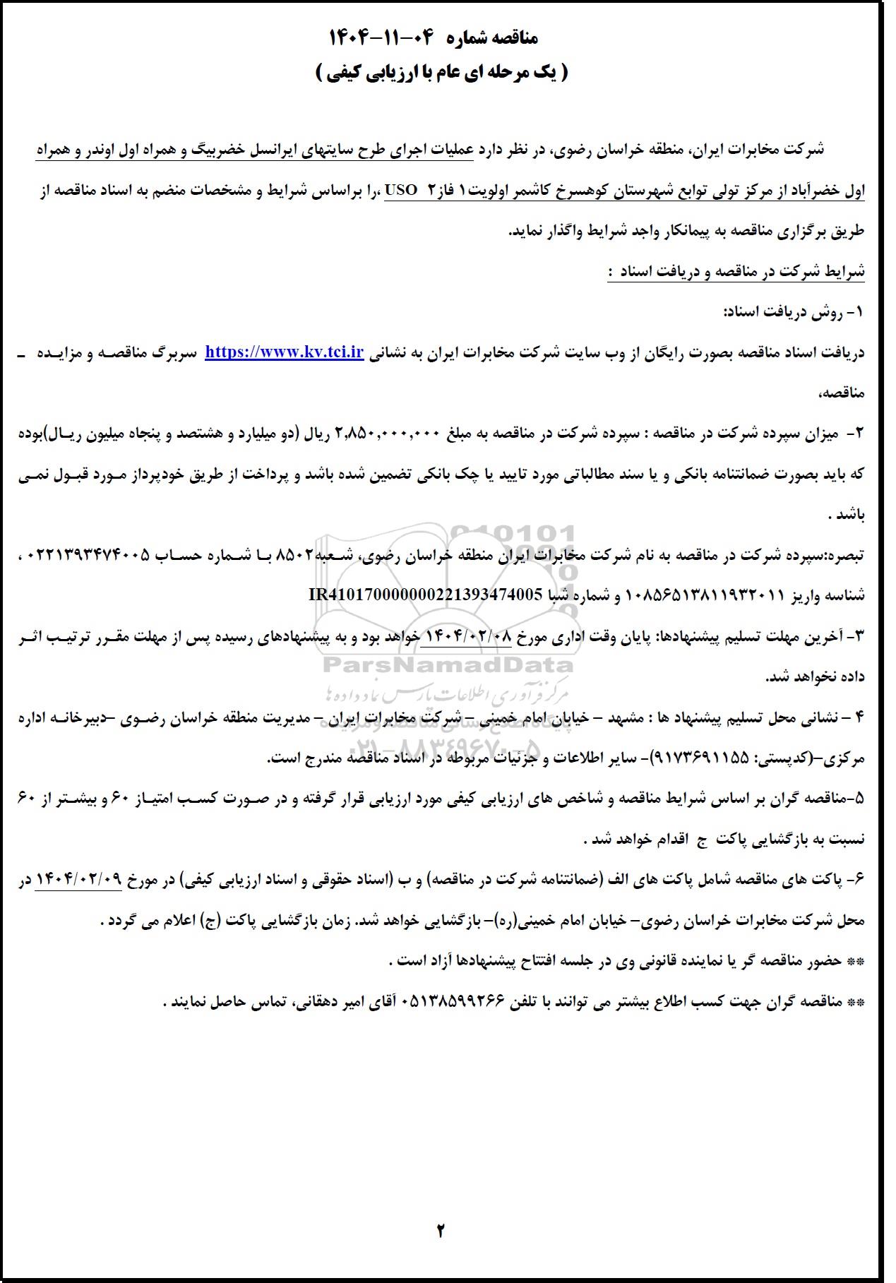 شرکت مخابرات ایران منطقه خراسان رضوی در نظر دارد عملیات اجرای طرح سایتهای ایرانسل خضربیگ و همراه اول اوندر و همراه اول خضرآباد از مرکز تولی توابع شهرستان کوهسرخ کاشمر اولویت 1 فاز 2 uso را بر اساس شرایط و مشخصات منضم به اسناد مناقصه از طریق برگزاری مناقصه به پیمانکار واجد شرایط واگذار نماید.