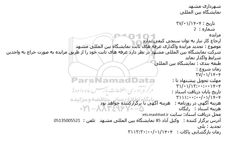 موضوع : تجدید مزایده واگذاری غرفه های ثابت نمایشگاه بین المللی مشهد