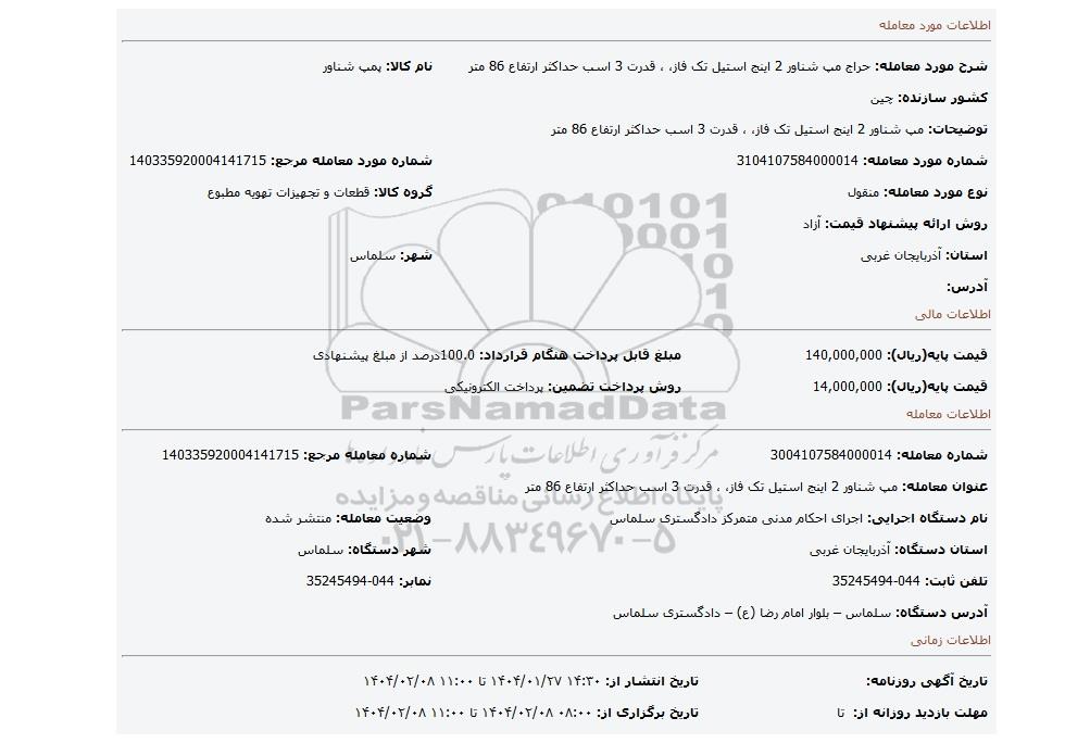 مزایده مپ شناور 2 اینج استیل تک فاز قدرت 3 اسب حداکثر ارتفاع 86 متر, مزایده، مپ شناور 2 اینج استیل تک فاز، ، قدرت 3 اسب حداکثر ارتفاع 86 متر