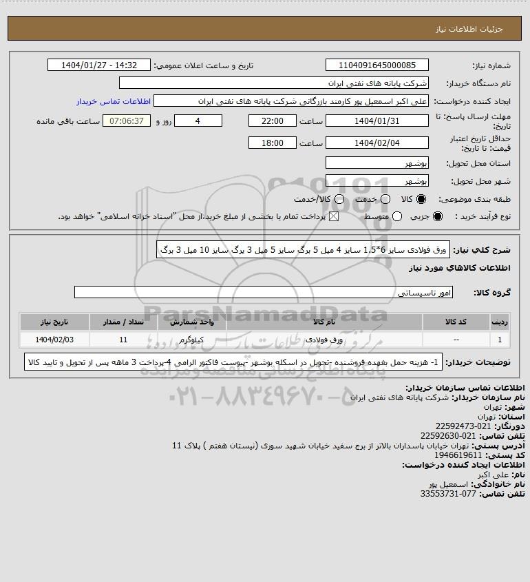 شرح کلی نیاز: ورق فولادی سایز 6*1.5 سایز 4 میل 5 برگ سایز 5 میل 3 یرگ سایز 10 میل 3 برگ