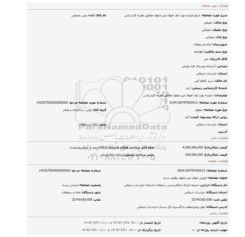 | نام دستگاه اجرایی: شعبه اجرای احکام مدنی سملقان اشخانه خراسان شمالی | وضعیت معامله: منتشر شده | |