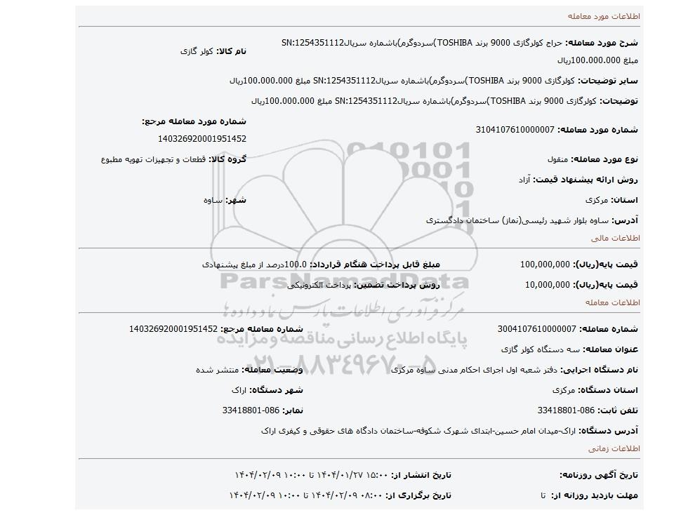 شرح مورد معامله: حراج کولرگازی 9000 برند TOSHIBA)سردوگرم)باشماره سریالSN:1254351112 مبلغ 100.000.000ریال نام کالا: کولر گازی