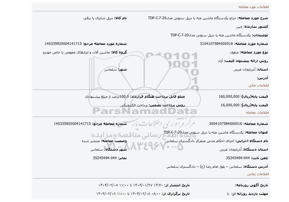 | شماره مورد معامله: 3104107584000016 | شماره مورد معامله مرجع: 140335920004141715 | |