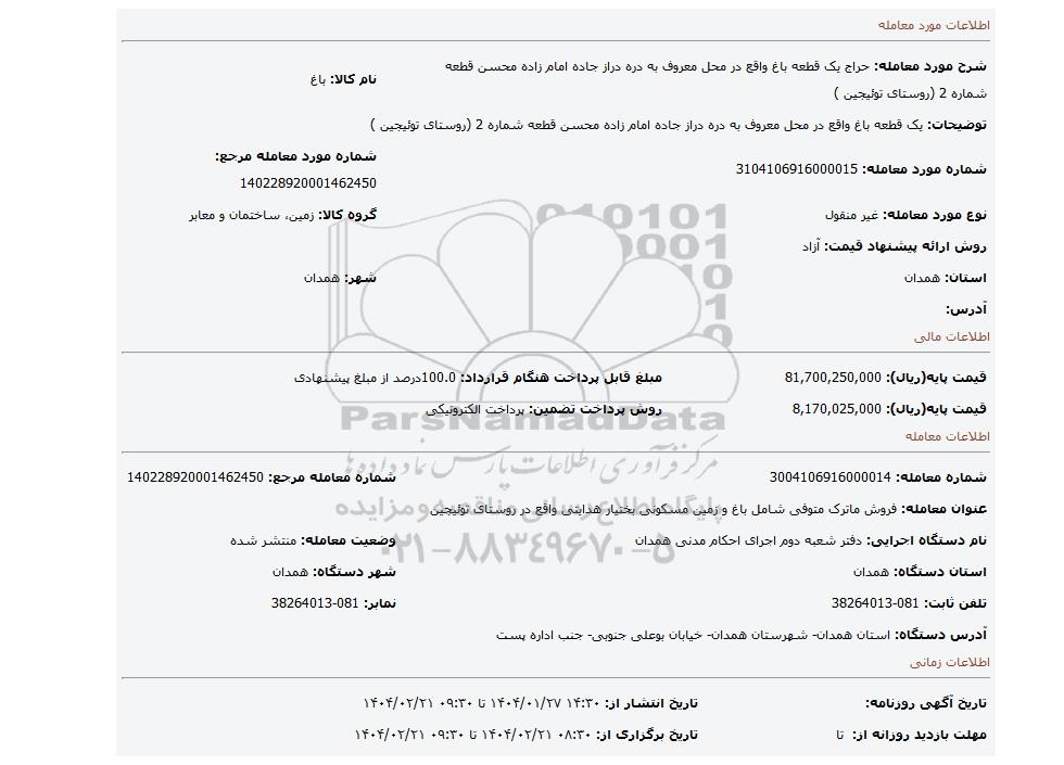 مزایده عمومی مزایده یک قطعه باغ واقع در محل معروف به دره دراز جاده امام زاده محسن قطعه شماره 2 (روستای توئیجین ) برگزار میگردد. از کلیه افراد متخصص و شرکتهای واجد شرایط دعوت به عمل میآید تا در این مزایده با کد خبرگزاری پارس نماد : 8885506 شرکت نمایند تاریخ شروع مزایده : 1404/01/27 مهلت شرکت در مزایده: تا پایان روز 1404/02/21 مکان برگزاری اموال واگذاری استانهای همدان و دستهبندیهای مربوط به این حراجی املاک و زمین میباشد.