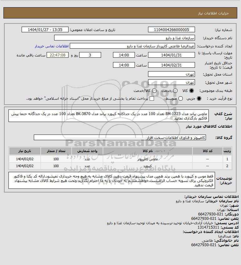 استعلام بها و موضوع استعلام استعلام ماوس بیاند مدل BM-1223 تعداد 100 عدد در پک جداکانه کیبورد بیاند مدل BK-3870 تعداد 100 عدد در پک جداگانه حتما پیش فاکتور بارگذاری نمایید به اطلاع کلیه شرکتها و افراد متخصص واجد شرایط میرساند، آگهی گذار در نظر دارد از طریق استعلام بها، نسبت به انتخاب و دریافت پیشنهادات اقدام نماید. این استعلام با کد آگهی ثبت شده در سامانه خبرگزاری پارس نماد : 8885536 منتشر شده است. مشخصات استعلام : تاریخ شروع استعلام: 1404/01/27 آخرین مهلت ارسال پیشنهاد قیمت : 1404/01/31 و محل اجرای پروژه : استان تهران میباشد. استعلام قیمت مورد درخواست : استعلام ماوس بیاند مدل BM-1223 تعداد 100 عدد در پک جداکانه کیبورد بیاند مدل BK-3870 تعداد 100 عدد در پک جداگانه حتما پیش فاکتور بارگذاری نمایید با دستهبندیهای تخصصی و گروه های مرتبط : کامپیوتر, استعلام اطلاع رسانی میگردد.