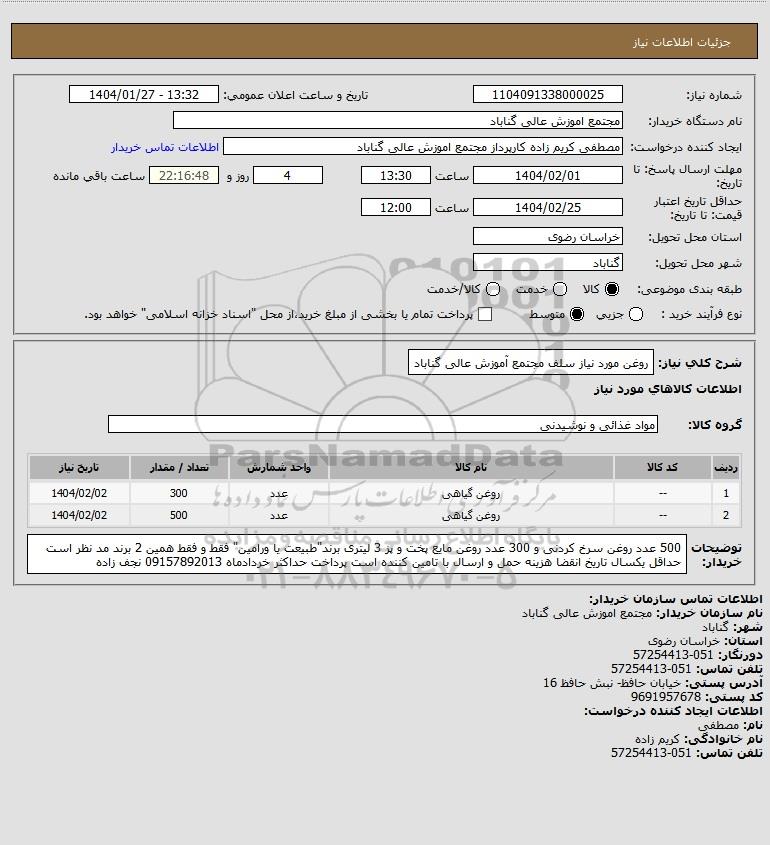 شرح کلی نیاز: روغن مورد نیاز سلف مجتمع آموزش عالی گناباد