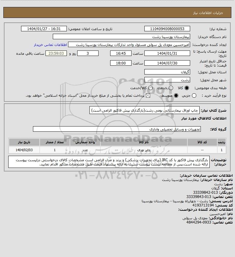 شرح کلی نیاز: چاپ اوراق بیمارستانی بومی رشت(بارگذاری پیش فاکتور الزامی است)