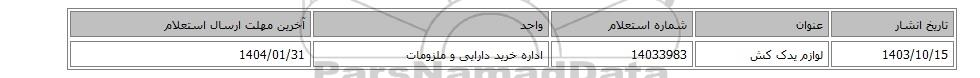 | 1403/10/15 | لوازم یدک کش | 14033983 | اداره خرید دارایی و ملزومات | 1404/01/31 |