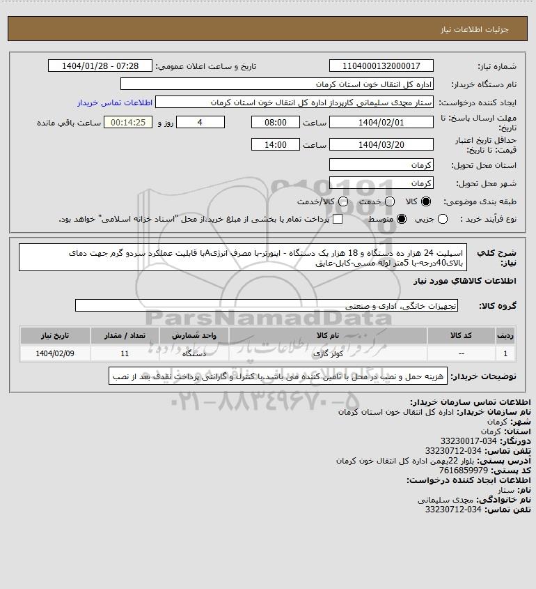 شرح کلی نیاز: اسپلیت 24 هزار ده دستگاه و 18 هزار یک دستگاه - اینورتر-با مصرف انرژیAبا قابلیت عملکرد سردو گرم جهت دمای بالای40درجه-با 5متر لوله مسی-کابل-عایق