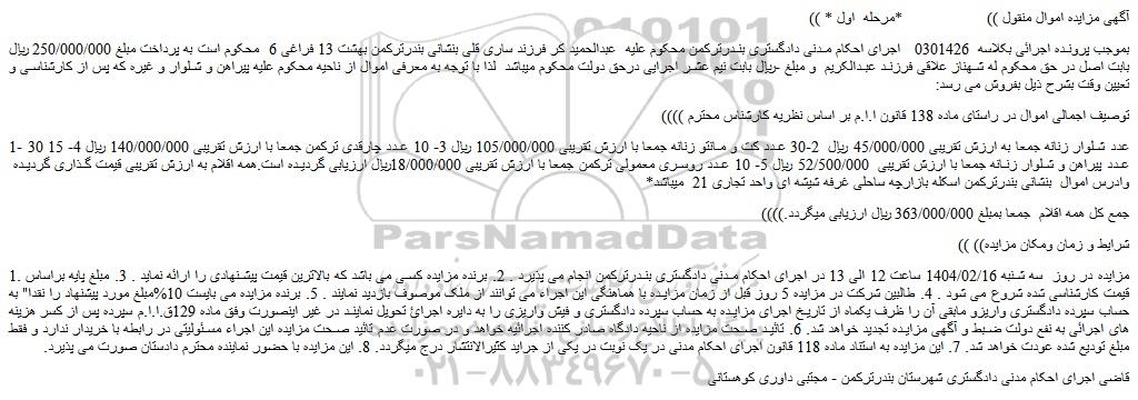 بموجب پرونده اجرائی بکلاسه  0301426   اجرای احکام مدنی دادگستری بندرترکمن محکوم علیه  عبدالحمید کر فرزند ساری قلی بنشانی بندرترکمن بهشت 13 فراغی 6  محکوم است به پرداخت مبلغ 250/000/000 ریال بابت اصل در حق محکوم له شهناز علاقی فرزند عبدالکریم  و مبلغ -ریال بابت نیم عشر اجرایی درحق دولت محکوم میباشد  لذا با توجه به معرفی اموال از ناحیه محکوم علیه پیراهن و شلوار و غیره که پس از کارشناسی و تعیین وقت بشرح ذیل بفروش می رسد: