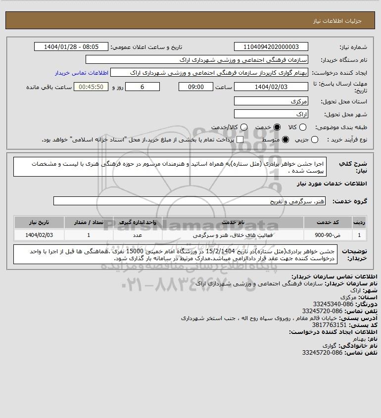 نام دستگاه خریدار:سازمان فرهنگی اجتماعی و ورزشی شهرداری اراک