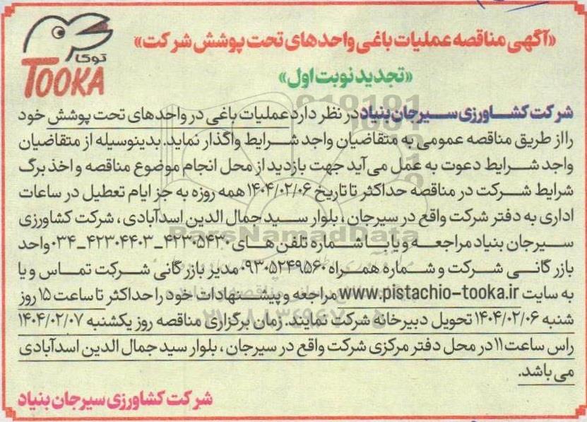 شرکت کشاورزی سیرجان بنیاد در نظر دارد عملیات باغی واحدهای تحت پوشش شرکت خود را از طریق مناقصه عمومی به متقاضیان واجد شرایط واگذار نماید. بدینوسیله از متقاضیان واجد شرایط دعوت به عمل می آید جهت بازدید از محل انجام موضوع مناقصه و اخذ برگ شرایط شرکت در مناقصه حداکثر تا تاریخ 1404.2.6 همه روزه بجز ایام تعطیل در ساعات اداری به دفتر شرکت واقع در سیرجان بلوار سید جمال الدین اسدآبادی، شرکت کشاورزی سیرجان بنیاد مراجعه و یا با شماره تلفنهای 42305430 - 42304403-034 واحد بازرگانی شرکت و شماره همراه 09305249560 مدیر بازرگانی شرکت تماس و یا به سایت www.pistachio-tooka.ir مراجعه و پیشنهادات خود را حداکثر تا ساعت 15 شنبه 1404.2.6 تحویل دبیرخانه شرکت نمایند. زمان برگزاری مناقصه روز یکشنبه 1404.2.7 رأس ساعت 11 در محل دفتر مرکزی شرکت واقع در سیرجان، بلوار سید جمال الدین اسد آبادی می باشد.