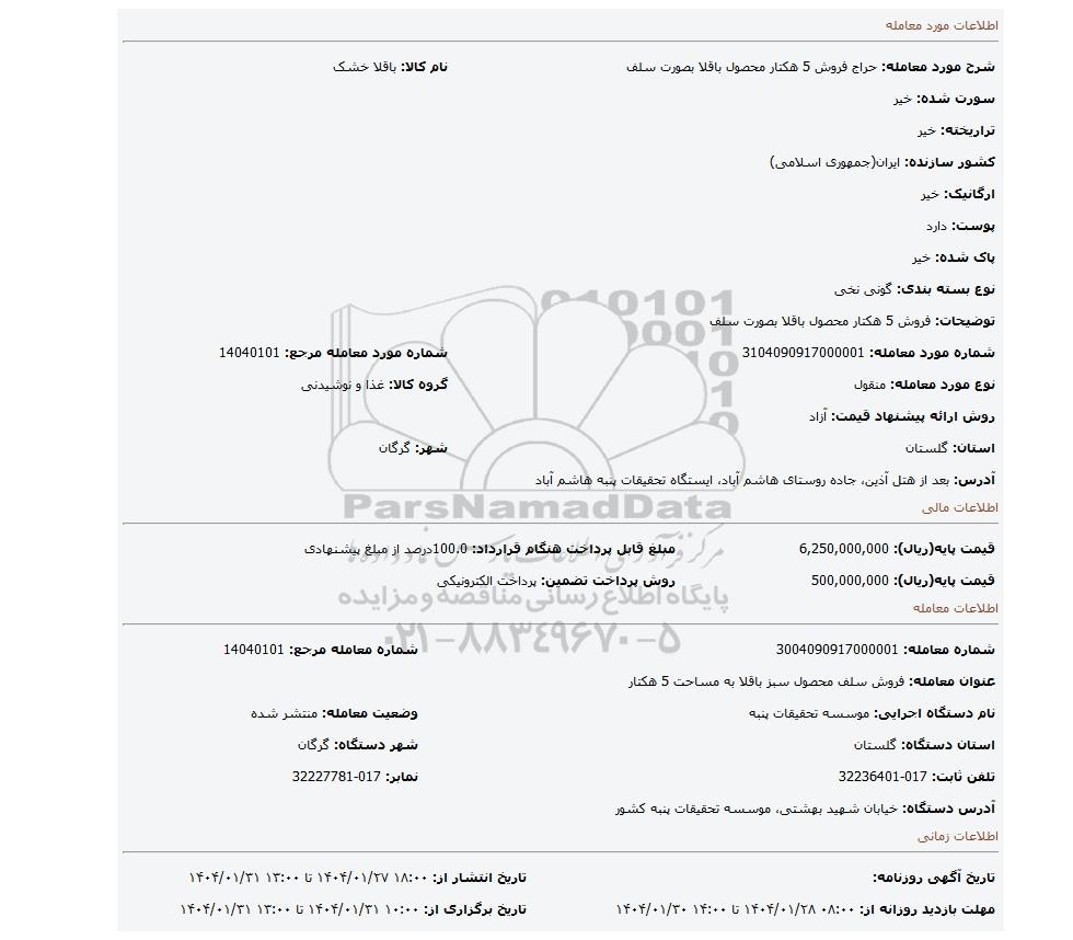 | شرح مورد معامله: حراج فروش 5 هکتار محصول باقلا بصورت سلف | نام کالا: باقلا خشک | |