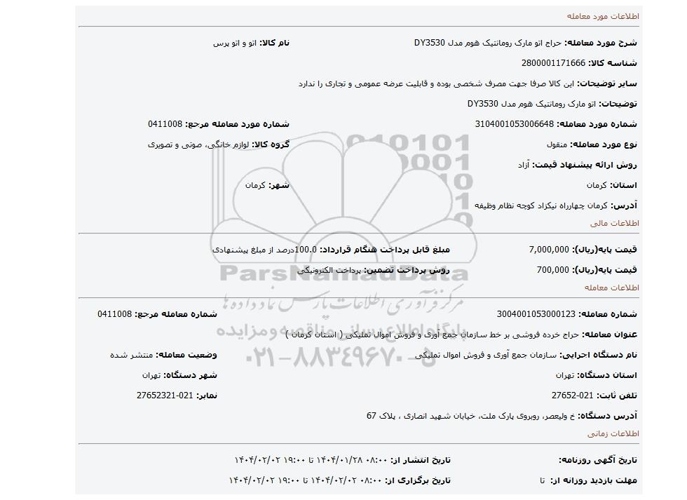 مزایده عمومی مزایده اتو مارک رومانتیک هوم مدل DY3530 برگزار میگردد. از کلیه افراد متخصص و شرکت‌های واجد شرایط دعوت به عمل می‌آید تا در این مزایده با کد خبرگزاری پارس نماد : 8887783 شرکت نمایند تاریخ شروع مزایده : 1404/01/28 مهلت شرکت در مزایده: تا پایان روز 1404/02/02 مکان برگزاری اموال واگذاری استان‌های کرمان و دسته‌بندی‌های مربوط به این حراجی متفرقه میباشد.