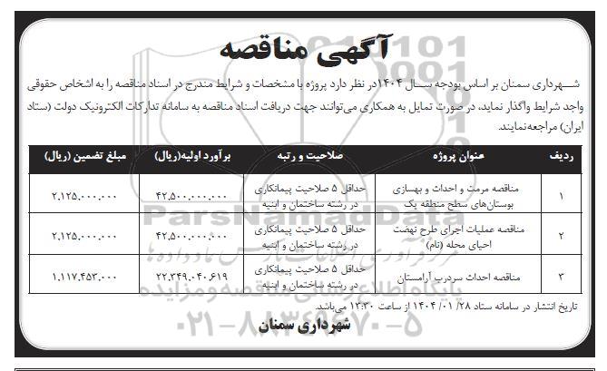 | 1 | مناقصه مرمت و احداث و بهسازی بوستان های سطح منطقه یک | حداقل 5 صلاحیت پیمانکاری در رشته ساختمان و ابنیه | 42.500.000.000 | 2.125.000.000 |