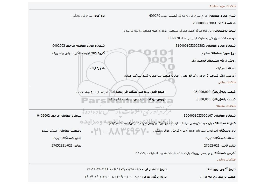 | عنوان معامله: حراج خرده فروشی برخط سازمان جمع آوری وفروش اموال تملیکی( استان مرکزی) | ||