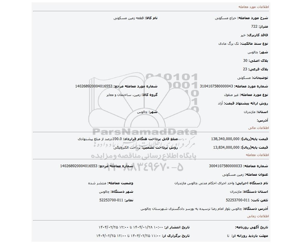 شرح مورد معامله: حراج مسکونی نام کالا: قطعه زمین مسکونی