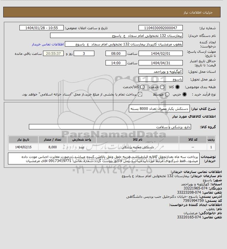 شرح کلی نیاز: دستکش یکبار مصرف تعداد 8000 بسته